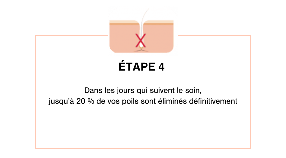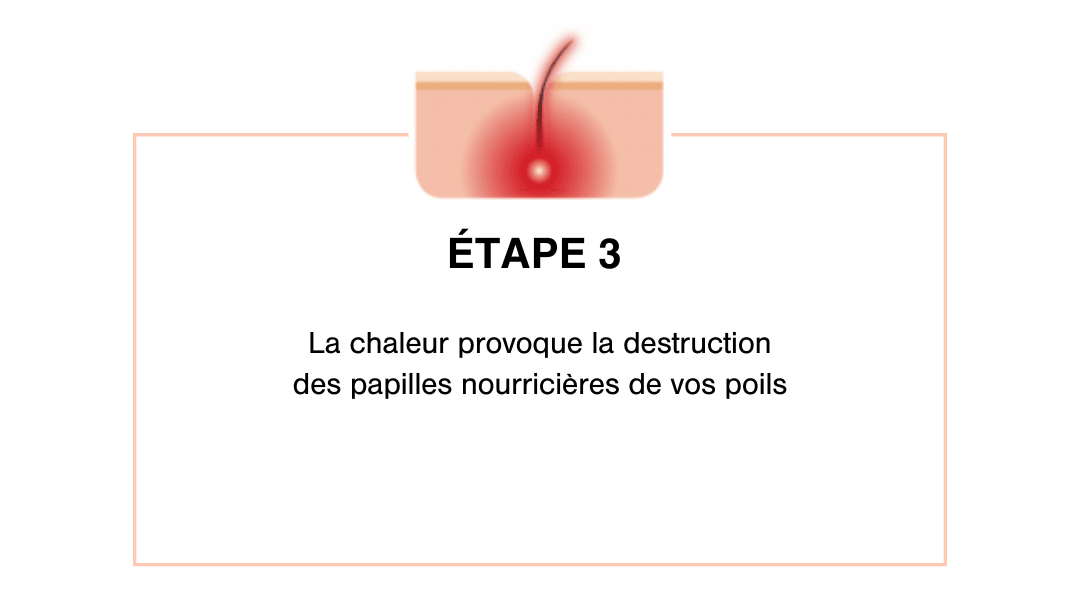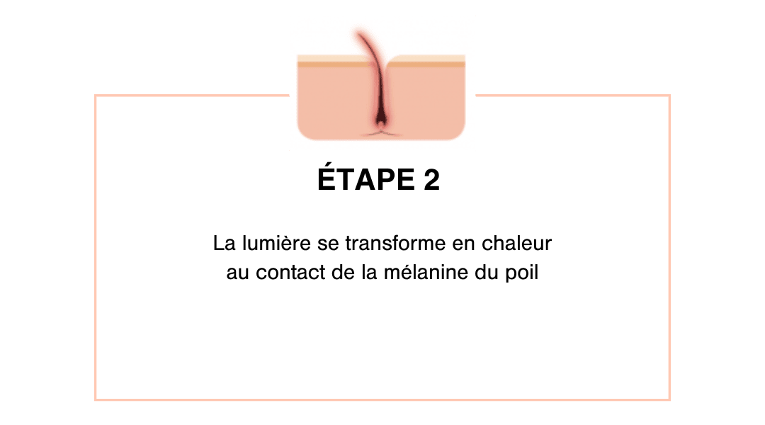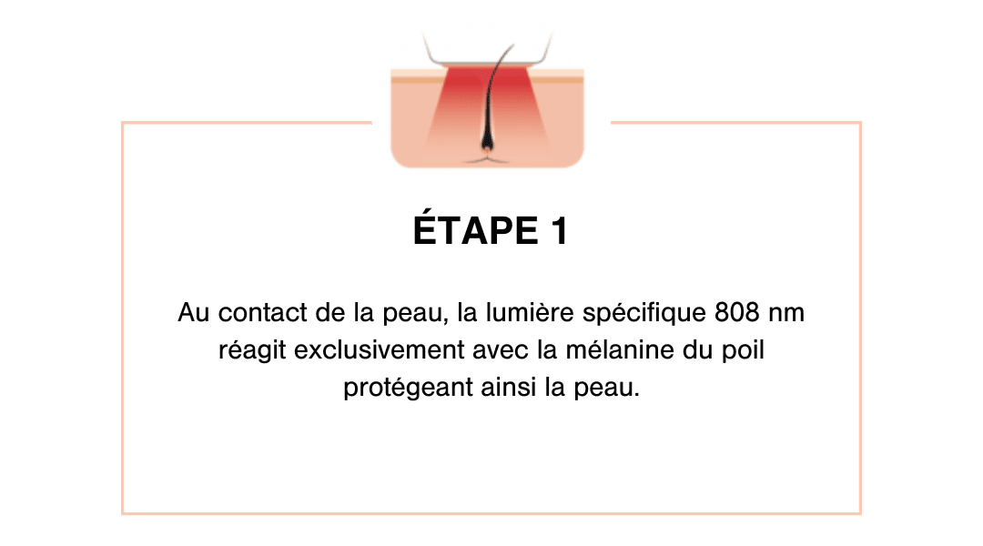 Les poils pigmentés absorbent le rayonnement lumineux diffusé par l’appareil qui se transforme en chaleur. L’effet thermique détruit les cellules germinatives pilaires responsables de la pousse du poil. Tout poil traité est donc éliminé sur le long terme et de manière définitive.